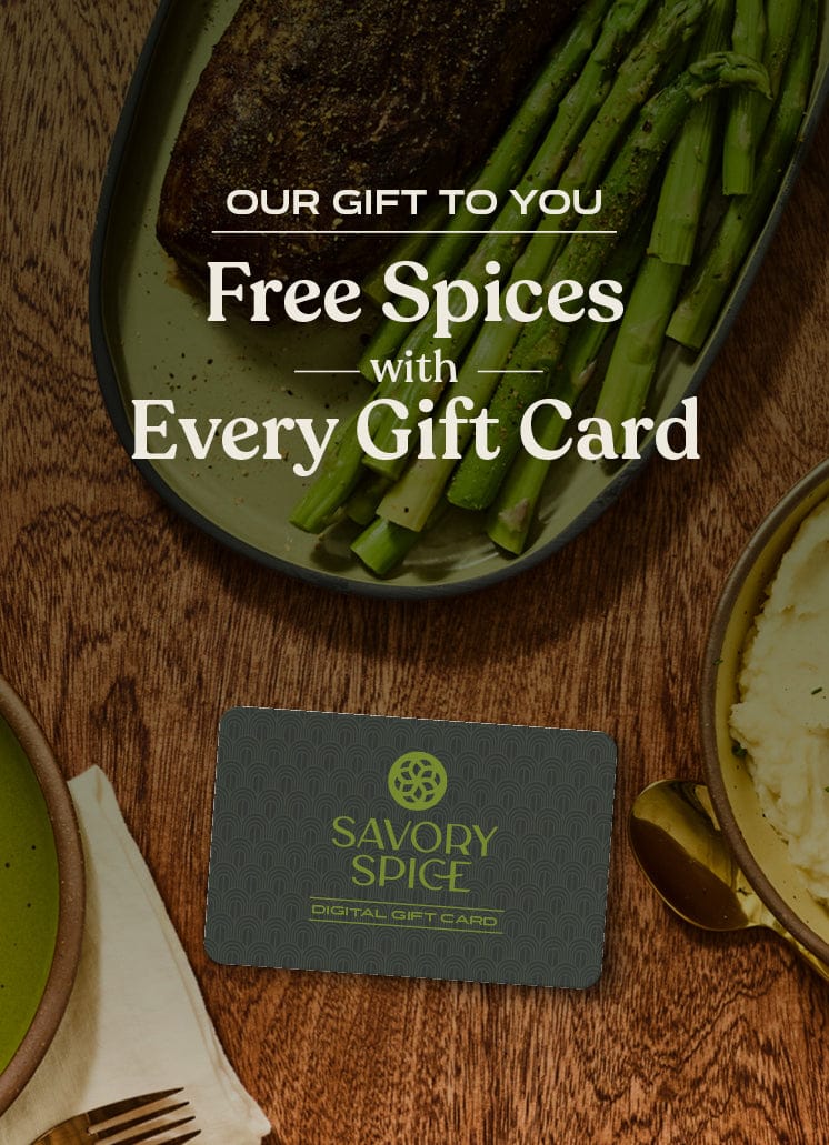 *Offer available online only. Purchase digital or physical gift cards in $20 increments, up to $100, and for each $20 gift card purchased, you will receive a $20 free spice reward, up to a maximum of $100 per customer. Free spice rewards are issued in $20 increments and must be purchased in increments of $20 to qualify. Free spice rewards will be emailed once your gift card order is shipped or fulfilled. Free spice rewards will be available to use between January 1, 2026 and October 31, 2026. There is no minimum purchase required to redeem Free Spice Rewards. Offer subject to availability. No adjustments on previous purchases. Offer expires at 12:59 PM MST, December 26, 2025. Additional restrictions may apply. See Our Gift To You FAQ page for full terms and conditions.