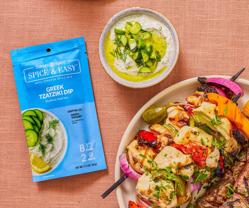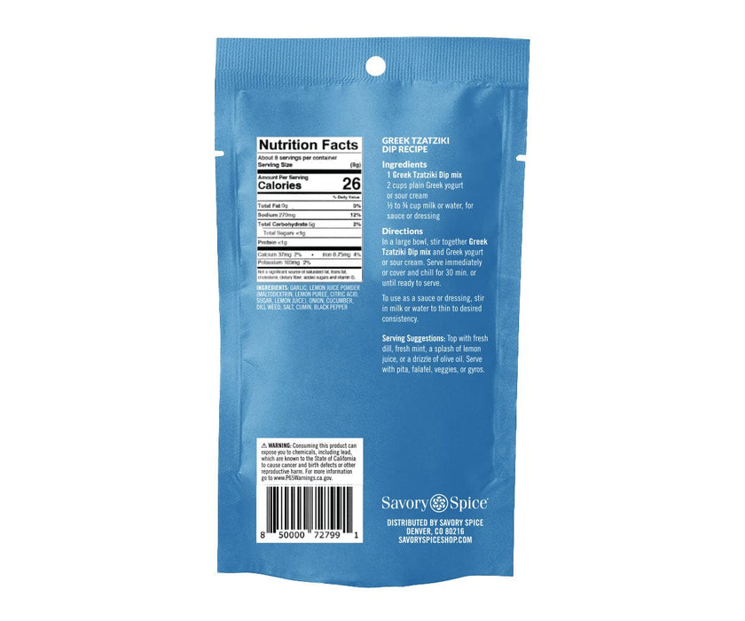This Greek-style tzatziki dip mix has the classic flavors and ingredients of tangy, garlicky tzatziki sauce. We even added the cucumbers, so all you need to do is mix it with Greek yogurt or sour cream and enjoy. Try as a tzatziki dip with pita chips, fresh veggies, or falafel. This tzatziki dip recipe mix can also be thinned with milk...