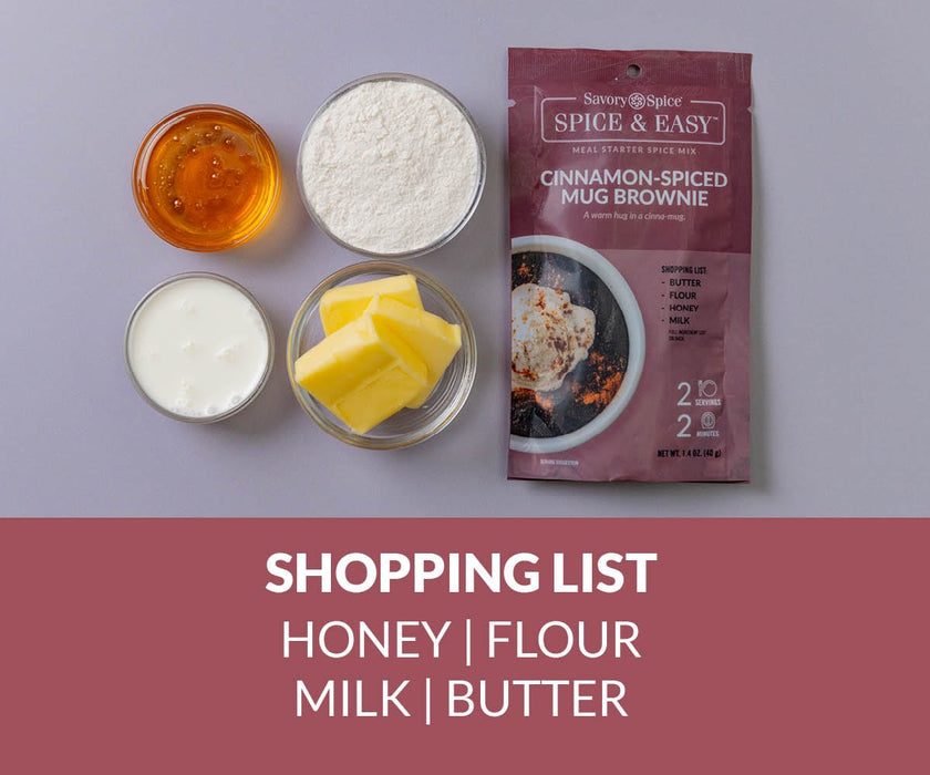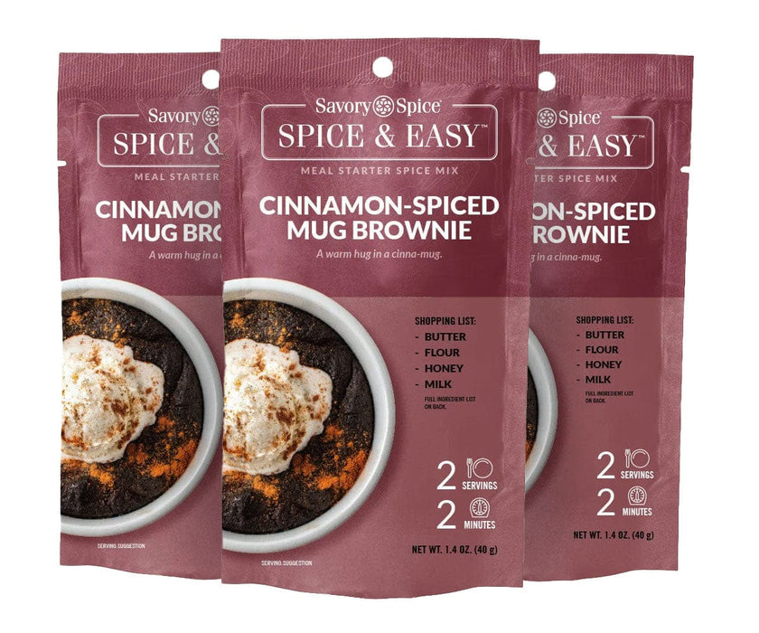 With Spice & Easy, making a mug brownie is as easy as 1, 2, 3! Just open mix, spice and serve. This easy brownie mix includes pre-measured ingredients needed to make a quick, simple and tasty brownie-in-a-mug recipe.