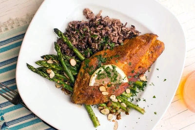 This is a perfect, light meal for springtime cooking. Seared asparagus is tossed with a choice of one of our favorite seasonings, and serves as a bed for an easy pan-fried fish, made crispy with gluten-free cornmeal and slightly smoky with our favorite paprika. The same method works great with chicken, pork cutlets, or tofu for a non-seafood version.