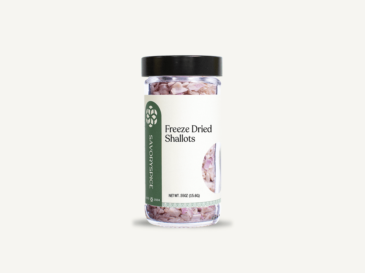Freeze dried shallots have all the flavor of fresh shallots, but have been chopped, dried and frozen. Sometimes, cooking with dry shallots can be easier than using fresh. Reconstitute by covering with equal parts water to shallot or use as-is in longer cooking processes.