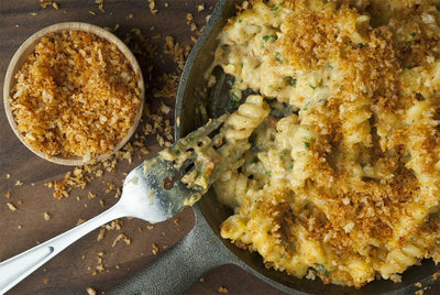 Add a little Southwestern flare to a classic BBQ side with this Tex Mex inspired mac loaded with green chiles, cilantro, and corn tortillas, and topped with smoked paprika bread crumbs.