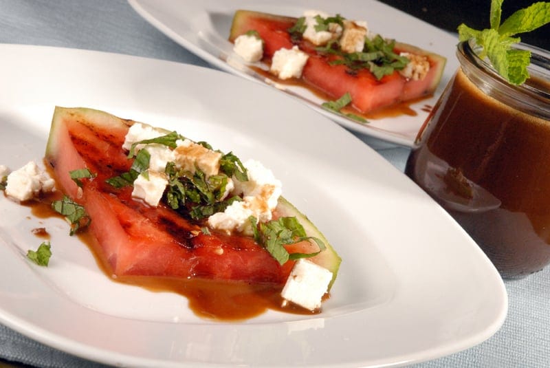 Grilled Watermelon “Caprese” Wedges with Pomegranate Molasses Vinaigrette