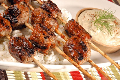Mix kebab ingredients together in a medium bowl until well combined. Refrigerate for 1 hour or more. Mix glaze ingredients together in a small bowl and set aside. Preheat grill to medium. To make kebabs, take palm size scoop of meat mixture and shape into ovals or meatball-style rounds and thread 3 or 4 to a skewer. Lay skewers on grill and cook 5 to 10 min. until cooked through with nice char marks. Turn frequently to make sure each side cooks evenly. Brush each kebab generously with glaze a few minutes before pulling off the grill, then brush again with more glaze if desired.