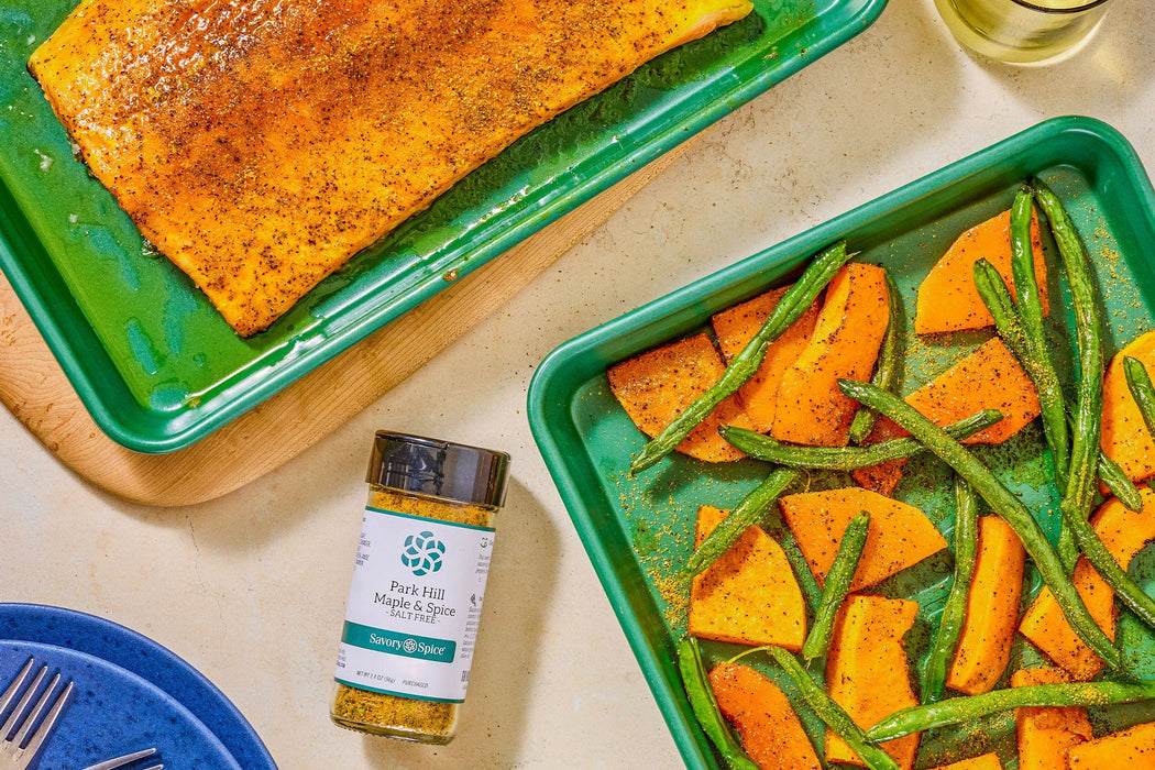 Preheat oven to 300 degrees. Place salmon filet on a baking sheet lined with foil. Brush salmon fillet evenly with olive oil. Season with salt, to taste. Sprinkle Park Hill Maple & Spice over the filet.