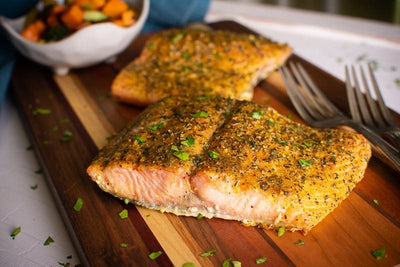 Place baking sheet in the oven and rotate after 10 min., continue cooking an additional 10 min. or until salmon reaches an internal temperature of 145 degrees.