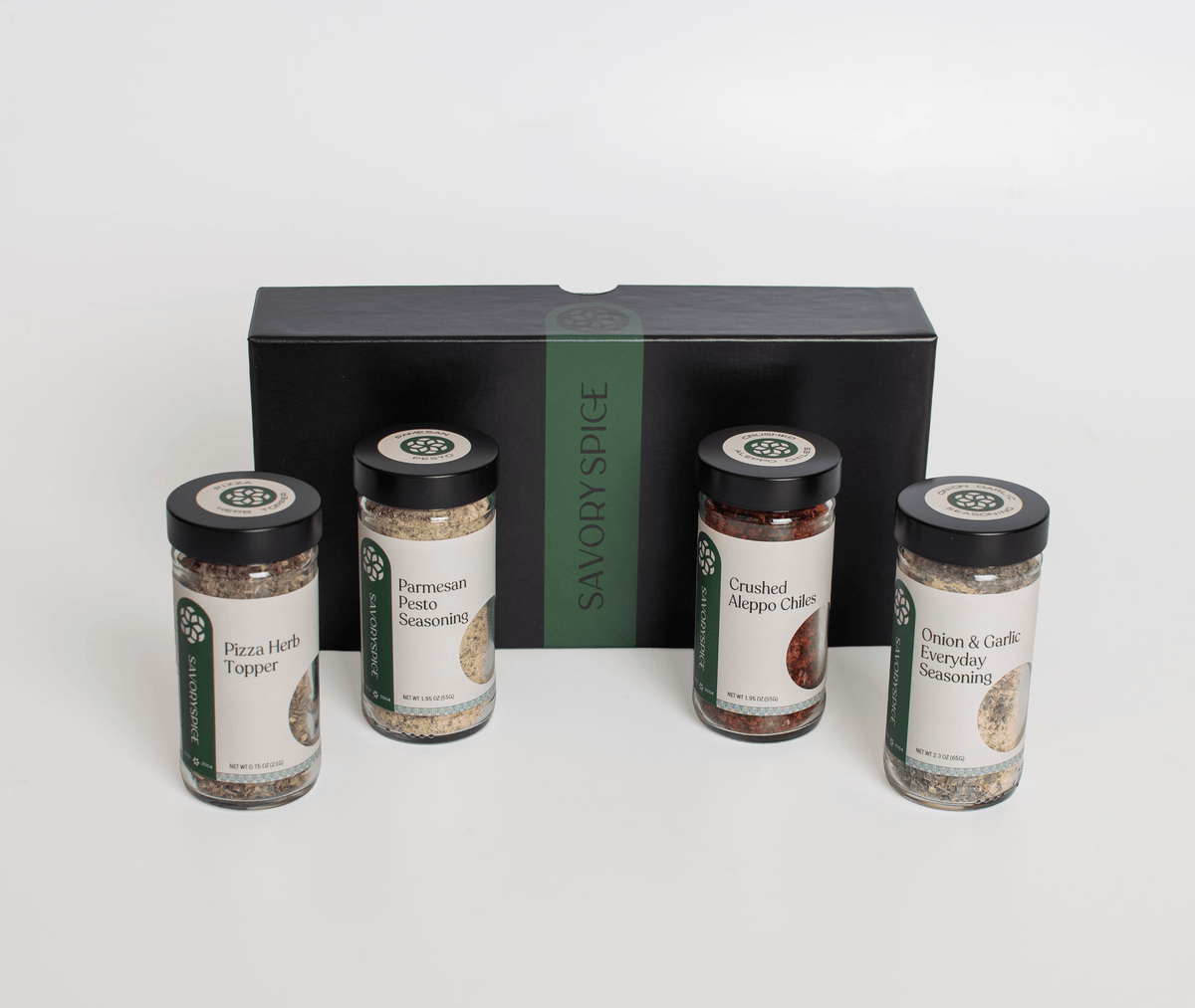 From parmesan cheese and Italian herbs to crushed red pepper flakes and a drizzle of hot honey, there are so many flavors you can add to pizza to enhance each bite. Our set includes onion & garlic seasoning, parmesan & pesto seasoning, Italian herbs and aleppo peppers.