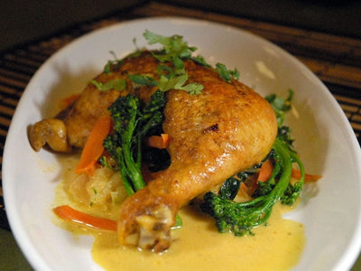 Mix oil, Vietnamese Sweet Lemon Curry Powder, Ground Cumin Seeds, fish sauce, and soy sauce together to make paste. Rub chicken pieces thoroughly with paste and place in food storage bag to marinate in refrigerator for 6 to 12 hours. When chicken is ready, preheat oven to 325 degrees. Lay sliced onion across bottom of baking sheet. Lay chicken pieces on top of onion and roast in oven until chicken is golden brown and cooked through, about 1 hour, 15 min. When chicken is done, start the sauce. Heat oil over medium-high heat in medium saucepan. Add vegetables and cook for a few minutes until they just start to soften. Add roasting juices from cooked chicken pan, chicken stock, coconut milk and fish sauce. Bring to a simmer and cook until sauce is reduced by about half. Pour sauce over chicken pieces when ready to serve. Garnish with cilantro.